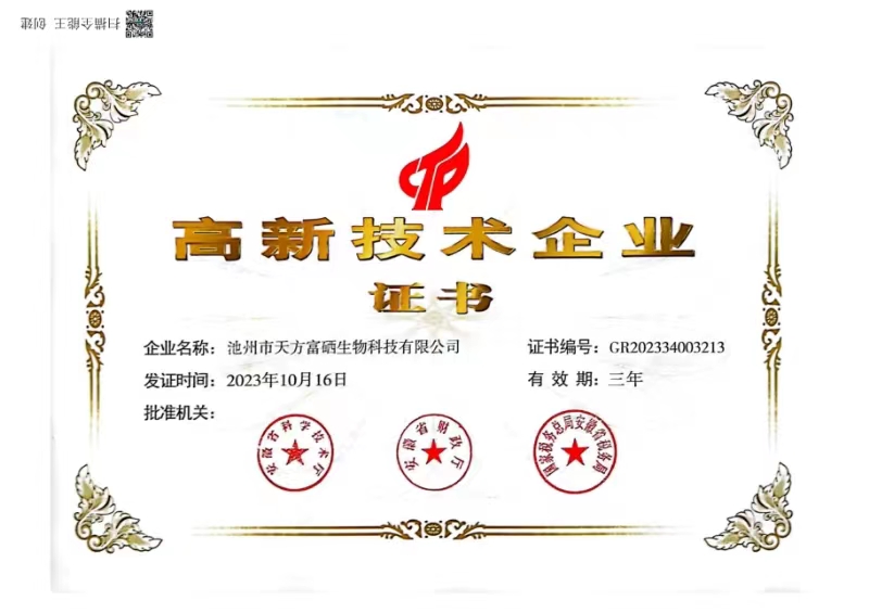 近日,池州市天方富硒生物科技有限公司正式通過高新技術企業認定,榮獲由安徽省科學技術廳、安徽省財政廳、國家稅務總局、安徽...